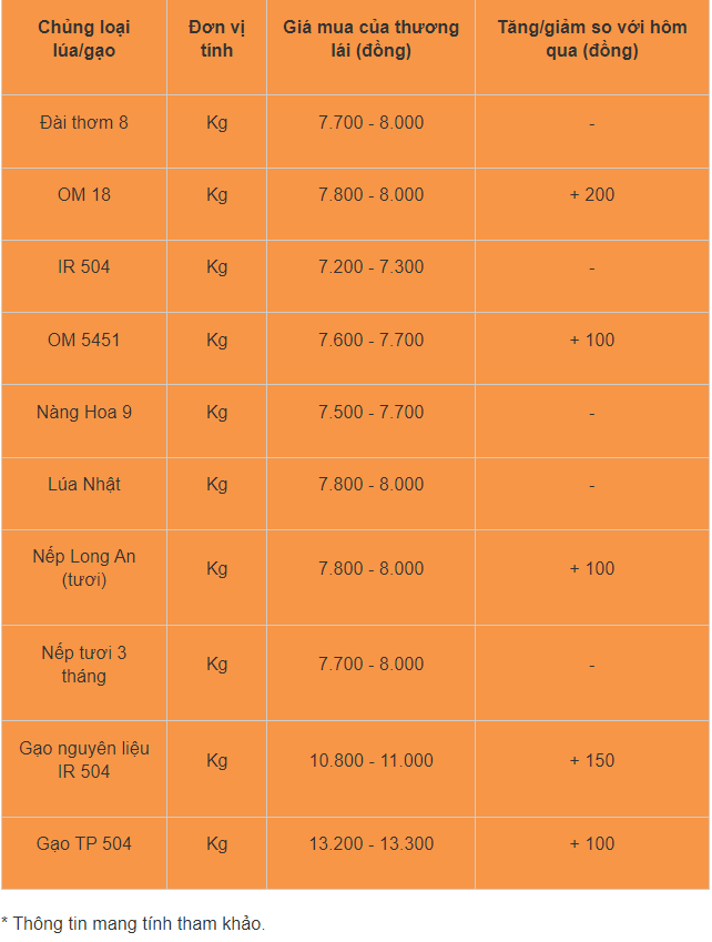 Với các loại lúa còn lại, giá đi ngang. Cụ thể lúa Đài thơm 8 dao động quanh mốc 7.700 - 8.000 đồng/kg; IR 504 ở mức 7.200 - 7.300 đồng/kg; lúa Nàng Hoa 9 dao động quanh mốc 7.500 - 7.700 đồng/kg; lúa OM 380 duy trì ổn định quanh mức 7.500 - 7.600 đồng/kg.