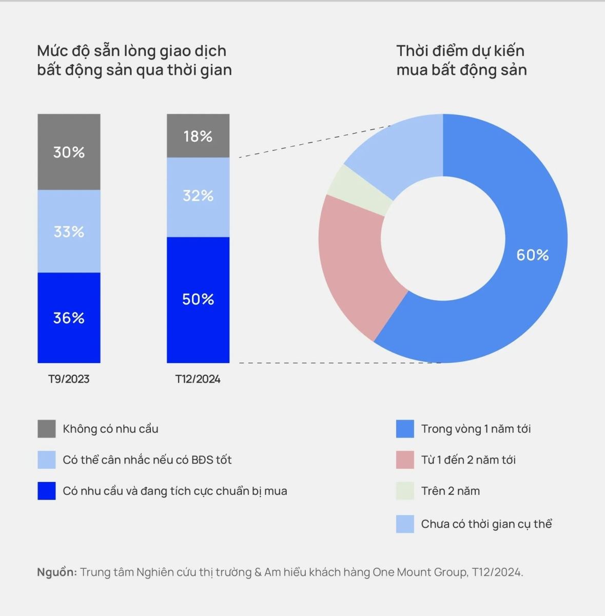 Theo báo cáo khảo sát khách hàng mới nhất của Trung tâm Nghiên cứu Thị trường & Am hiểu Khách hàng One Mount Group, tâm lý người mua nhà đang có dấu hiệu tích cực, với mức độ cân nhắc và chuẩn bị mua nhà tăng dần trong năm 2024. Cụ thể, hơn 80% người được hỏi bày tỏ nhu cầu sở hữu nhà (tăng 15% so với cùng kỳ năm trước) trong đó, 50% khách hàng đang ở giai đoạn cân nhắc và tích cực chuẩn bị giao dịch.