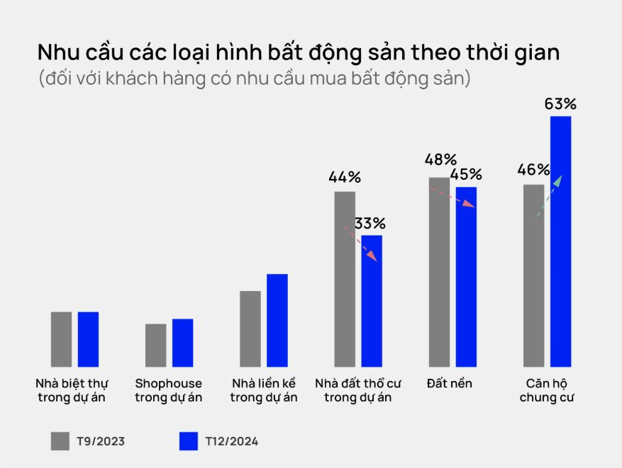 Kết quả nghiên cứu cũng chỉ ra xu hướng dịch chuyển trong nhu cầu đối với các loại hình bất động sản. Theo khảo sát từ One Mount vào cuối tháng 9/2023, mức độ quan tâm đến các phân khúc đất nền, nhà thổ cư và chung cư khá cân bằng. Tuy nhiên, đến tháng 12/2024, chung cư trở thành lựa chọn nổi bật hơn khi tỷ lệ khách hàng quan tâm tăng từ 46% năm 2023 lên 63% vào năm 2024, trong khi nhu cầu đối với nhà thổ cư có dấu hiệu giảm.