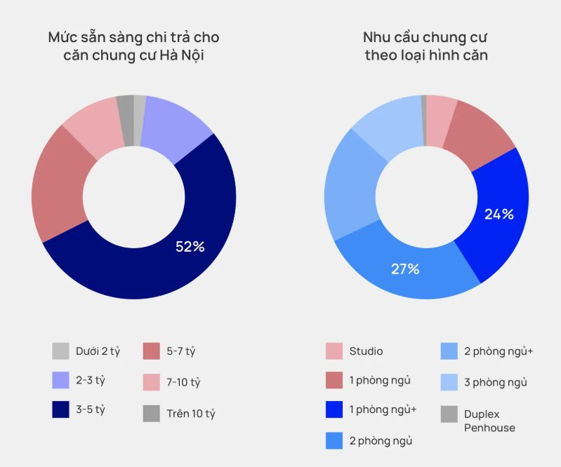 Từ khảo sát của One Mount, trong phân khúc chung cư, hơn 50% khách hàng sẵn sàng chi trả trong khoảng 3-5 tỷ đồng. Các căn hộ 1 ngủ +1 và 2 ngủ nhận được sự quan tâm nhiều nhất từ người mua.