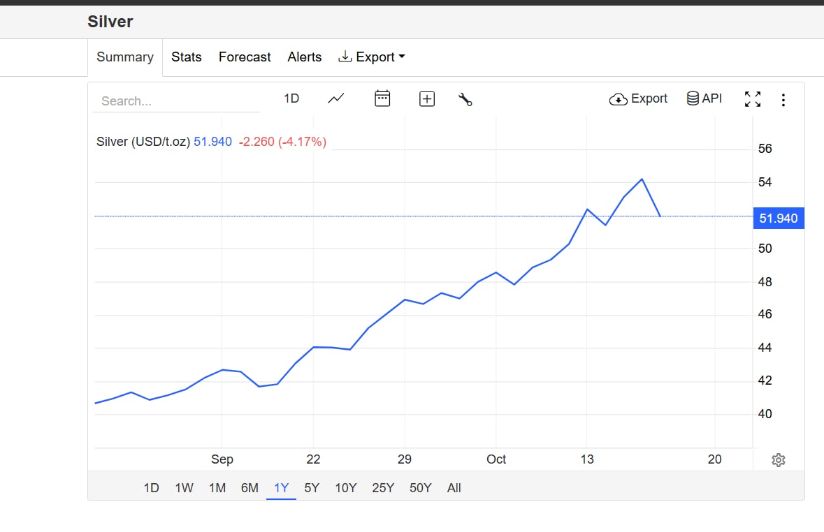 Giá bạc giảm hơn 4% xuống còn 51,8 USD/ounce vào ngày 18/10, rút khỏi mức kỷ lục 54,2 USD/ounce, sau khi Tổng thống Donald Trump cố gắng xoa dịu nỗi lo về chiến tranh thương mại Mỹ-Trung.