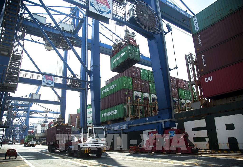 Bốc dỡ hàng hóa xuất khẩu tại Tân Cảng Cát Lái, thành phố Thủ Đức. Ảnh: Hồng Đạt - TTXVN