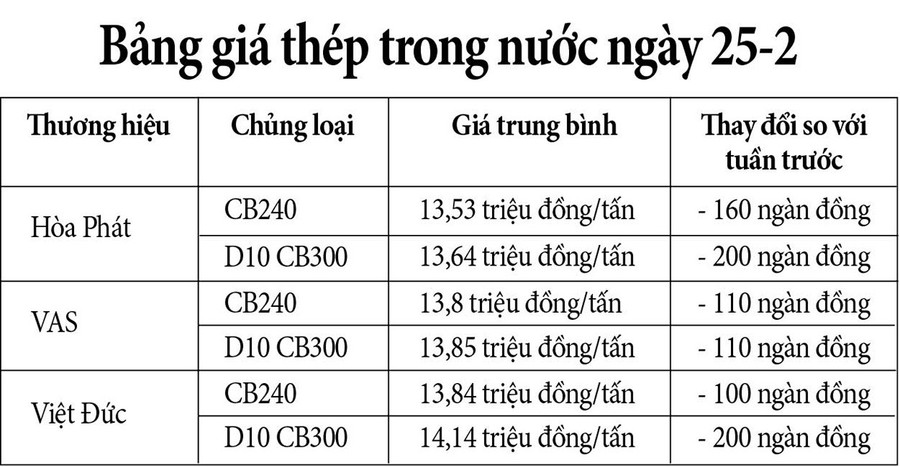 Ngày 25-2, giá thép trong nước đồng loạt giảm 100-200 ngàn đồng/tấn so với tuần trước.
