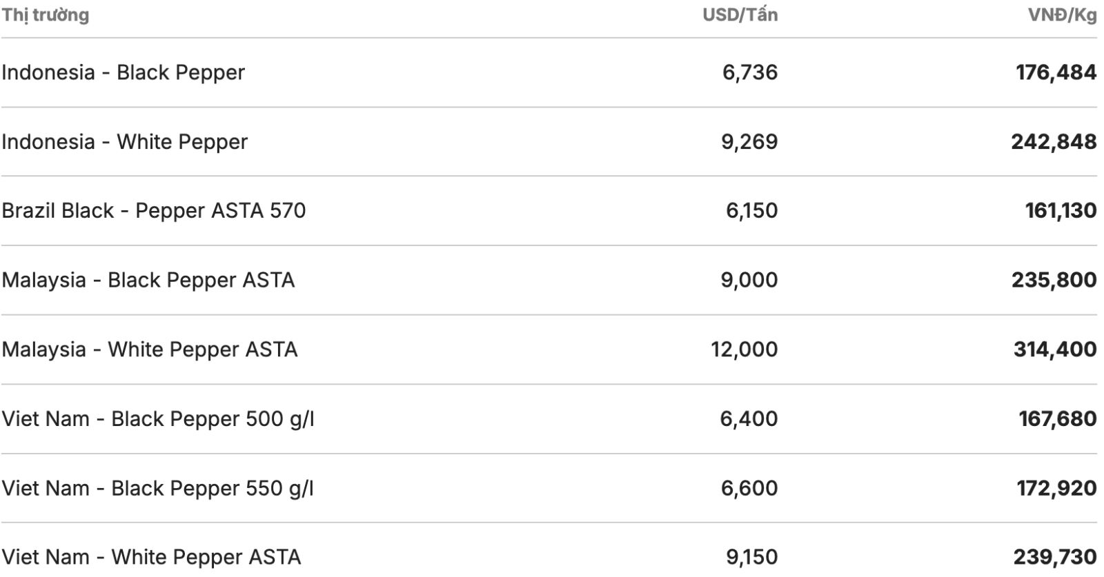 Trong khi đó, thị trường Brazil giữ đà tăng, giao dịch tại mốc 6.150 USD/tấn (khoảng 161.130 VND/kg). Tiêu đen và trắng tiếp tục không đổi, giao dịch ở mức 12.000 USD/tấn và 9.000 USD/tấn.
