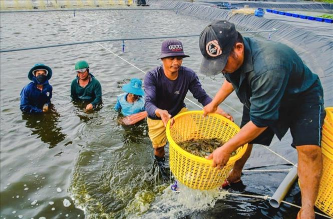 Giá tôm cao hơn từ 30% - 50% so với cùng kỳ năm 2025, người nuôi có lãi gần 100.000 đồng/1kg. Ảnh: TTXVN phát