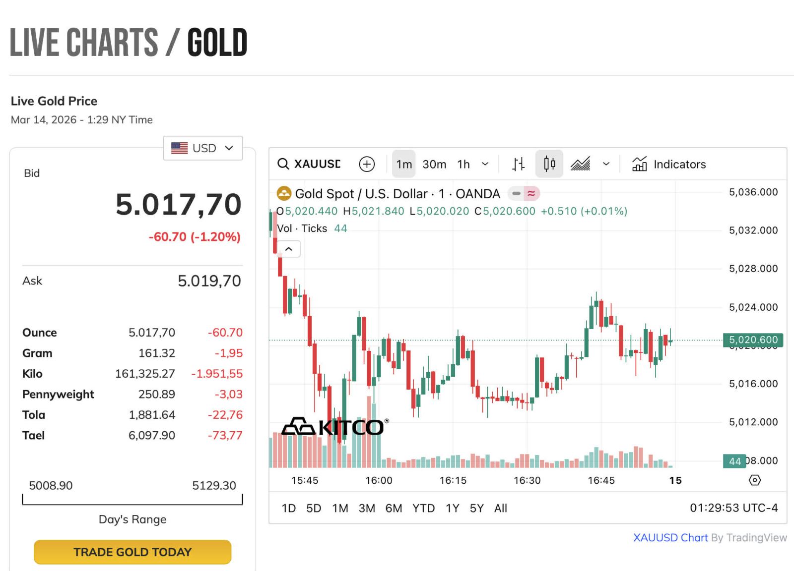 Trên thị trường quốc tế, giá vàng khép lại tuần giao dịch quanh ngưỡng 5.000 USD/ounce. Theo dữ liệu từ Kitco, trong phiên giao dịch cuối tuần tại New York, giá vàng chốt phiên lúc 17 giờ ngày 13/3 (giờ miền Đông Mỹ, khoảng 5 giờ sáng 14/3 giờ Việt Nam) ở mức 5.017,7 USD/ounce, giảm 60,70 USD, tương đương 1,2% so với phiên trước.