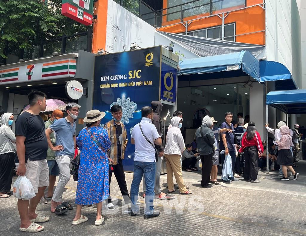 Ghi nhận tại Trung tâm Vàng bạc đá quý SJC Minh Khai (Quận 3, TP. Hồ Chí Minh), số lượng khách đến giao dịch đông từ sáng. Đến trưa, nhiều người vẫn xếp hàng dài để chờ tới lượt giao dịch.