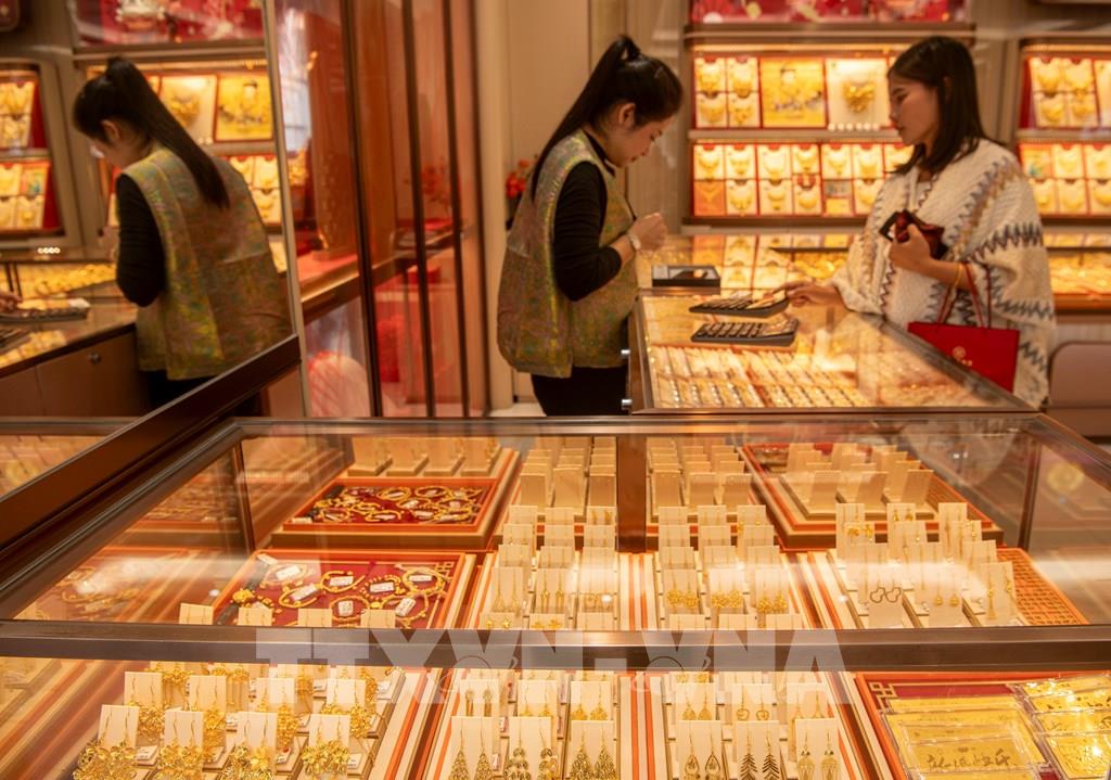 Khách hàng chọn mua trang sức vàng tại cửa hàng ở Hải Nma, Trung Quốc. Ảnh: THX/TTXVN