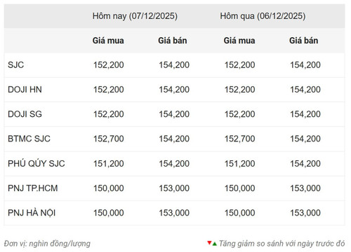 Cụ thể, tại thời điểm 8 giờ 30 phút sáng 7/12, Công ty Vàng bạc đá quý Sài Gòn (SJC) niêm yết giá vàng miếng SJC mua vào-bán ra ở mức 152,2-154,2 triệu đồng/lượng, giảm 700.000 đồng so tuần cuối trước. Chênh lệch mua-bán 2 triệu đồng/lượng.