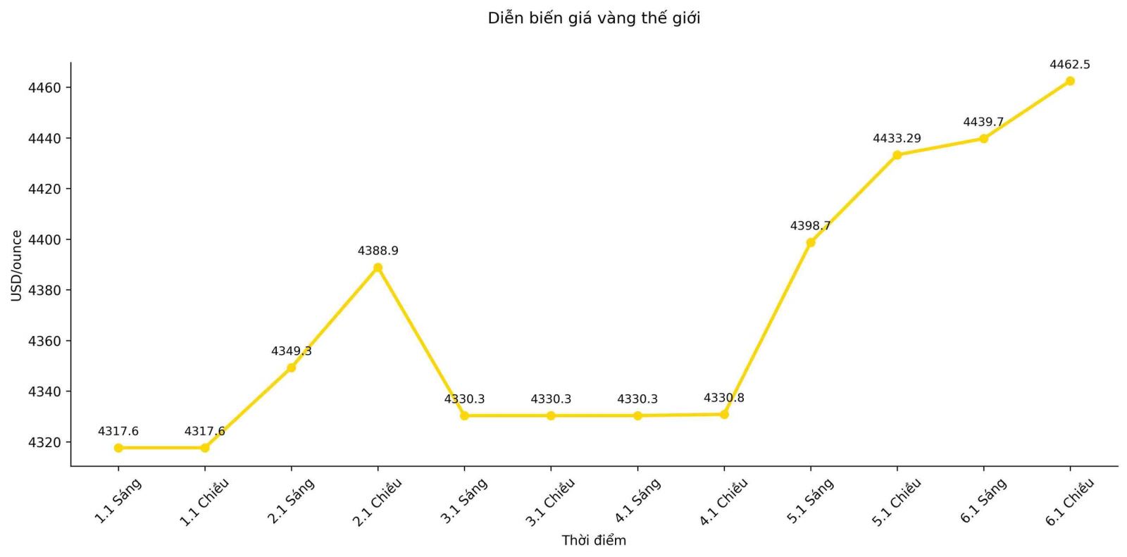 Giá vàng giao ngay hầu như không thay đổi, dao động quanh mức 4.461.76 USD/ounce, sau khi tăng 2,7% trong phiên trước đó nhờ thông tin lực lượng Mỹ bắt giữ lãnh đạo Venezuela Nicolás Maduro. Tình hình chính trị tại quốc gia Nam Mỹ này vẫn tiềm ẩn nhiều bất ổn, đặc biệt sau khi Tổng thống Mỹ Donald Trump tuyên bố Washington có kế hoạch “điều hành” Venezuela. Trong diễn biến liên quan, bà Delcy Rodríguez đã tuyên thệ nhậm chức quyền tổng thống.