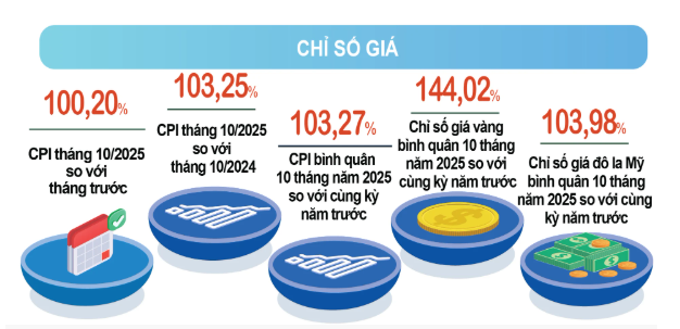 CPI tháng 10/2025 tăng 0,20% so với tháng trước; tăng 2,82% so với tháng 12/2024; tăng 3,25% so với cùng kỳ năm trước. Bình quân mười tháng năm 2025, CPI tăng 3,27% so với cùng kỳ năm trước; lạm phát cơ bản tăng 3,20%.
