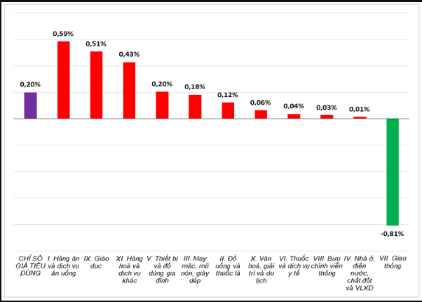 Tốc độ tăng/giảm CPI tháng 10/2025 với các nhóm hàng hóa so với tháng trước đó. Nguồn: Cục Thống kê