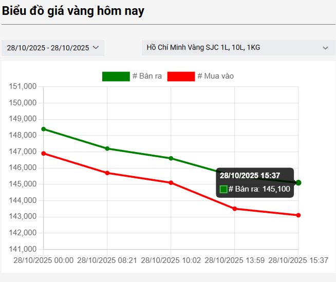 Sáng 28/10, Công ty Vàng bạc đá quý Sài Gòn (SJC) đã buộc phải thực hiện điều chỉnh biểu giá vàng miếng lần thứ hai. Theo đó, giá vàng miếng SJC niêm yết tại 145,1 - 146,6 triệu đồng/lượng, đánh dấu sự sụt giảm đáng kể ngay từ đầu phiên. Tuy nhiên, đà giảm không dừng lại ở đó.