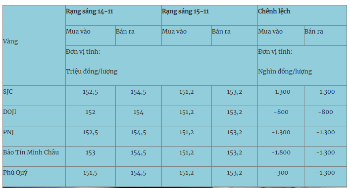 Giá vàng hôm nay (15-11): Giá vàng miếng và vàng nhẫn đã mất giá từ 800.000 đồng/lượng đến 1,8 triệu đồng/lượng chỉ trong 24 giờ qua. Giá vàng miếng SJC được bán ra cao nhất ở mức 153,2 triệu đồng/lượng.