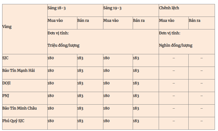 Các thương hiệu SJC, Bảo Tín Mạnh Hải, DOJI, PNJ, Bảo Tín Minh Châu và Phú Quý đồng loạt niêm yết giá vàng miếng ở mức 180 - 183 triệu đồng/lượng mua vào - bán ra, giữ nguyên giá so với hôm qua.