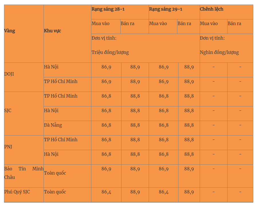 Giá vàng miếng trong nước cập nhật lúc 5 giờ 30 phút sáng 29-1 như sau: