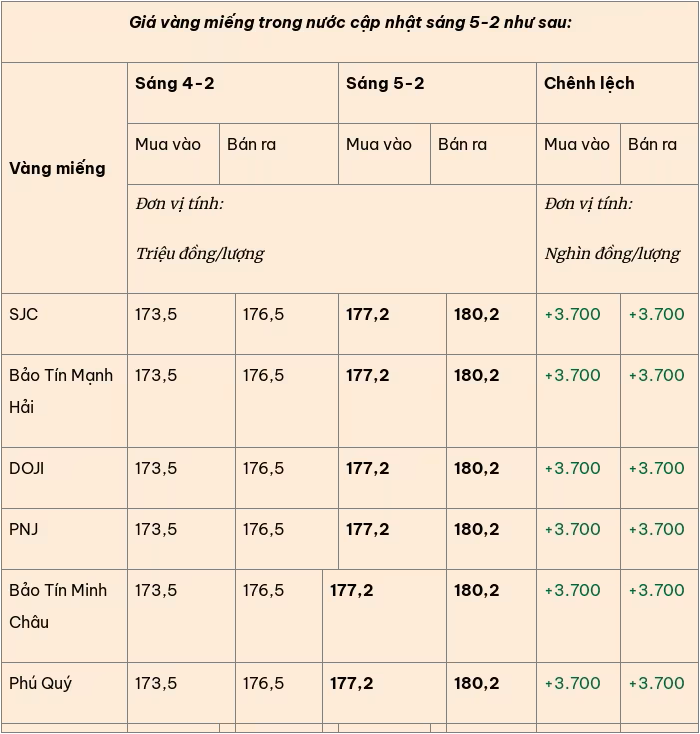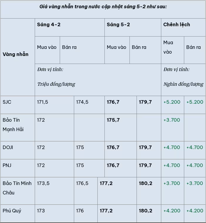 Giá vàng hôm nay (5-2): Giá vàng miếng, vàng nhẫn trong nước tiếp đà tăng mạnh, vượt mức 180 triệu đồng/lượng bán ra tại một số thương hiệu vàng lớn; giá vàng thế giới tăng áp sát mức 5.000 USD/ounce.