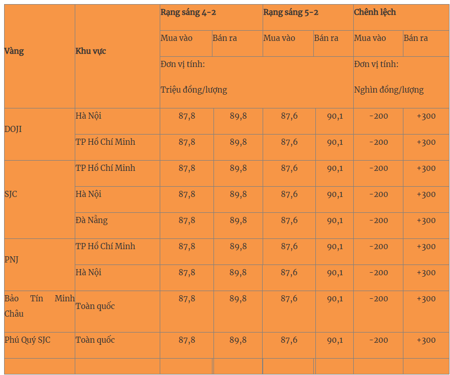 Giá vàng miếng các thương hiệu đang mua vào 87,6 triệu đồng/lượng và bán ra mức 90,1 triệu đồng/lượng.
