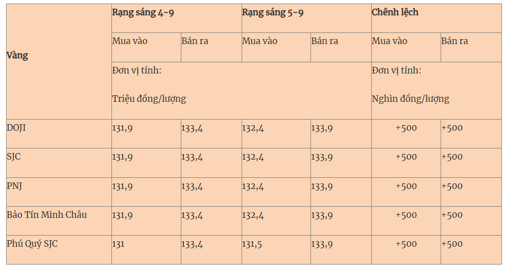 Các thương hiệu SJC, DOJI, PNJ, Bảo Tín Minh Châu đồng loạt niêm yết giá vàng miếng ở ngưỡng 132,4 - 133,9 triệu đồng/lượng (mua vào - bán ra), tăng 500 nghìn đồng/lượng ở cả hai chiều so với rạng sáng qua.
