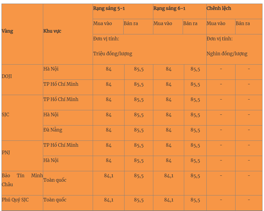 Giá vàng miếng trong nước cập nhật lúc 5 giờ 30 phút sáng 6-1 như sau: