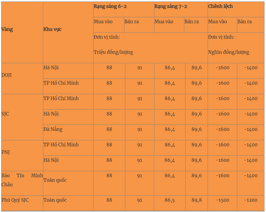 Sau chuỗi ngày tăng mạnh, giá vàng trong nước bất ngờ quay đầu giảm mạnh trong ngày 6-2, với giá vàng miếng và vàng nhẫn đều giảm hơn 1 triệu đồng cả chiều mua và bán. Hiện tại, giá vàng các thương hiệu được niêm yết cụ thể như sau: