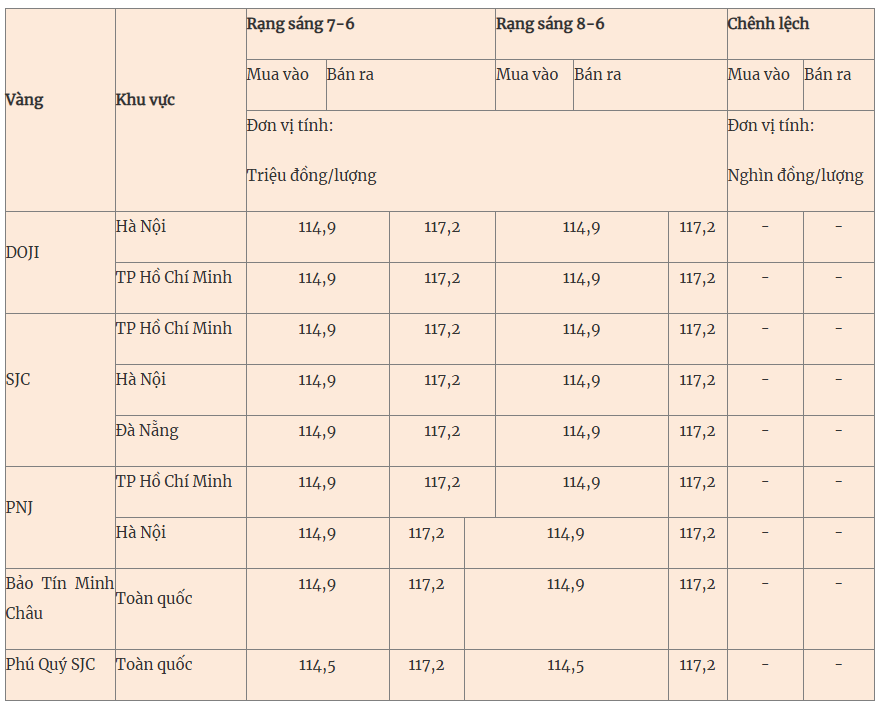 Giá vàng miếng trong nước hôm nay ổn định so với hôm qua. Kết thúc ngày 7-6, vàng các thương hiệu đang mua vào ở mức 114,9 triệu đồng/lượng và bán ra mức 117,2 triệu đồng/lượng.