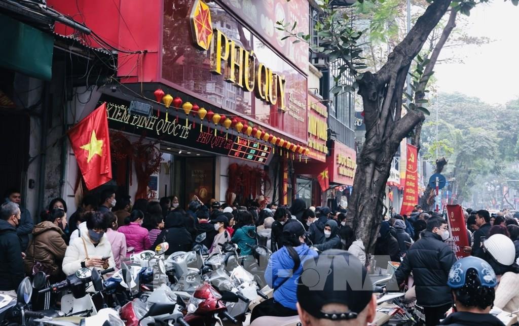 Dòng người xếp hàng chờ mua vàng trên phố Trần Nhân Tông (ảnh chụp lúc 9 giờ ngày 29/1). Ảnh: Trần Việt - TTXVN