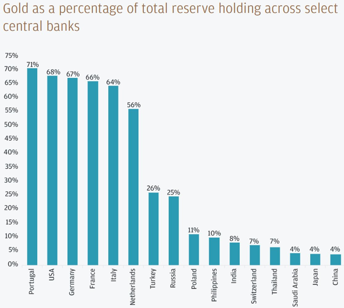 Tỷ lệ vàng trong tổng dự trữ của một số ngân hàng trung ương đáng chú ý.