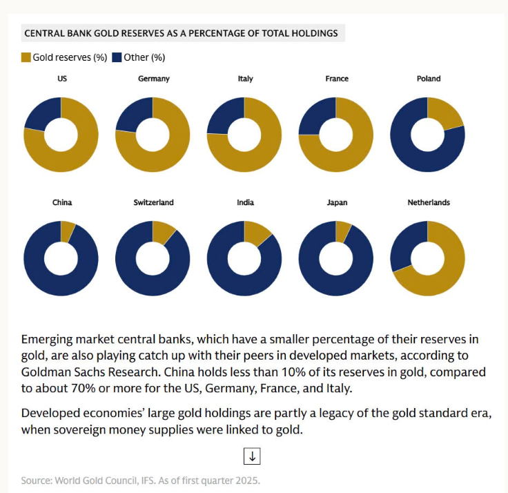 Dự trữ vàng của ngân hàng trung ương tính theo tỷ lệ phần trăm tổng lượng vàng nắm giữ ở một số quốc gia. Nguồn: Goldman Sachs (dữ liệu WGC, IFS - Quý I/2025).