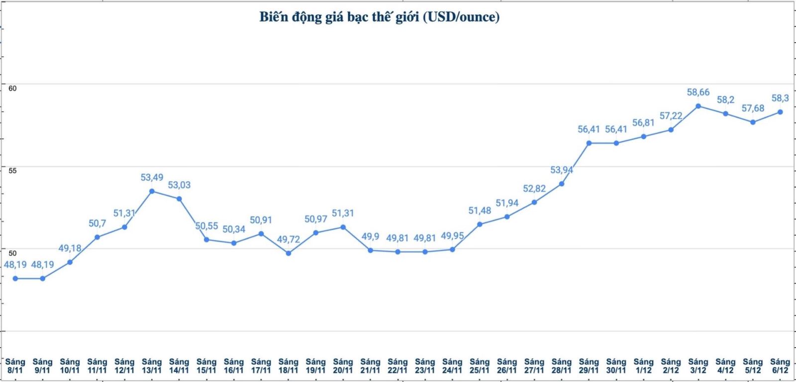 Giá bạc bước vào cuối tuần ở mức đỉnh kỷ lục mới, vượt 58 USD/ounce. Không chỉ ghi nhận lực mua bám đuổi mạnh mẽ trong tuần qua, các nhịp điều chỉnh của bạc cũng rất nông, với vùng hỗ trợ duy trì quanh mức đỉnh của tuần trước, gần 56 USD.