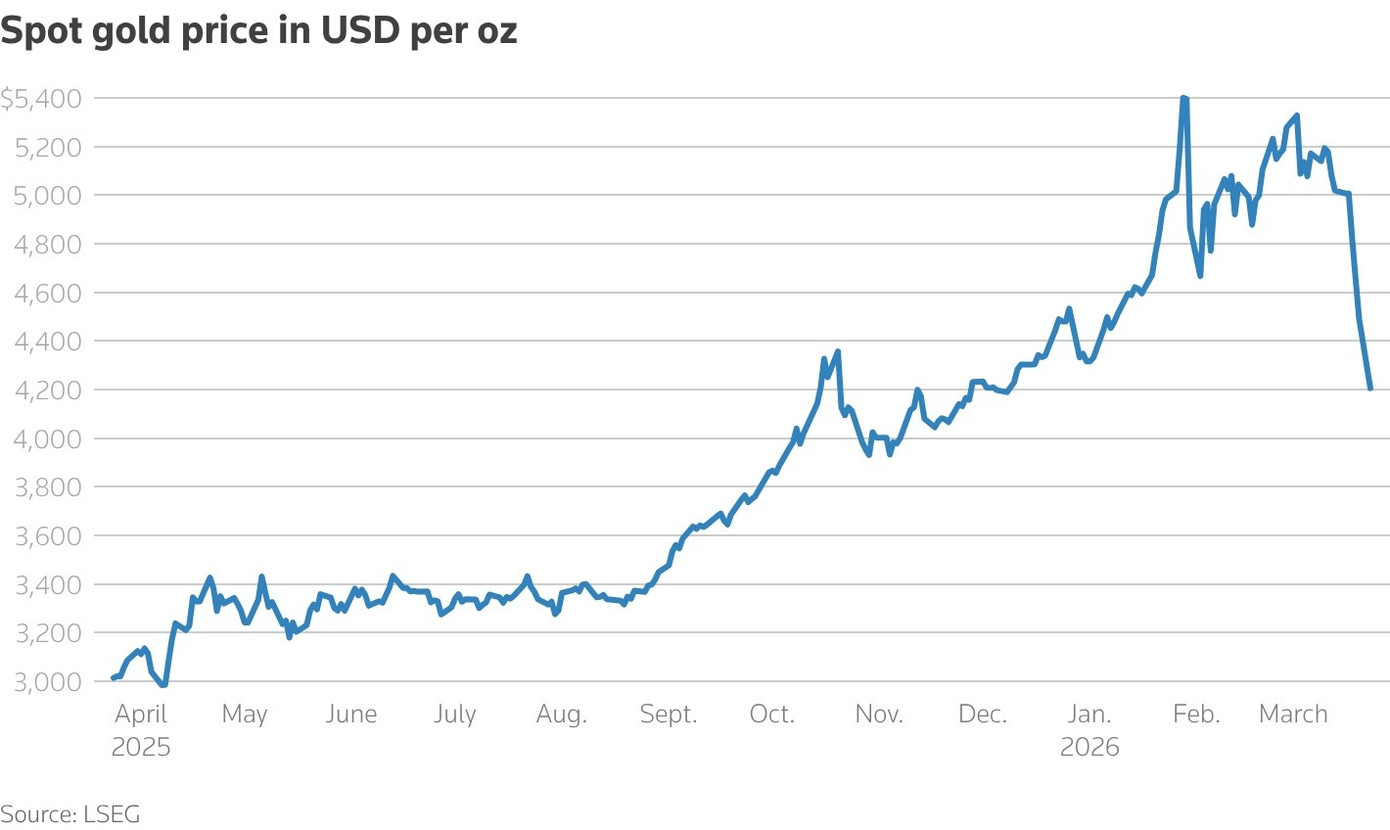 Trong phiên giao dịch sáng đầu tuần (giờ Mỹ, 23/3), giá vàng giao ngay giảm 6,3% xuống còn 4.203,21 USD/ounce, nối dài chuỗi giảm sang phiên thứ chín liên tiếp. Trước đó trong phiên, kim loại quý này từng lao dốc hơn 8%, chạm mức 4.097,99 USD/ounce, mức thấp nhất kể từ ngày 24/11/2025.