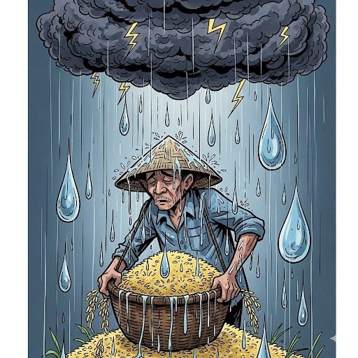 Những cơn mưa lớn kéo dài khiến lúa thu hoạch bị ẩm, độ ẩm cao, chất lượng giảm sút. Hạt lúa không còn đẹp, không đạt chuẩn, thương lái và doanh nghiệp lại có thêm lý do để ép giá. Đã thế, năng suất vụ này cũng thấp hơn hẳn mọi năm.