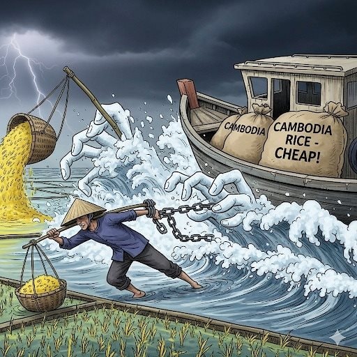 Khi thị trường đang rối ren, một "nhân vật" không mời mà đến đã xuất hiện và làm tình hình thêm tồi tệ: lúa gạo giá rẻ từ Campuchia. Lượng lúa này "chảy" mạnh qua biên giới với giá thấp hơn, tạo ra một cuộc cạnh tranh khốc liệt. Dù muốn hay không, các quán cũ cũng phải cân nhắc giảm giá nếu không muốn mất khách.