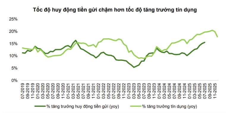 Theo số liệu từ NHNN, tính đến cuối năm 2025, tăng trưởng tín dụng đạt khoảng 19%, trong khi huy động vốn chỉ tăng 14,1%. Sự chênh lệch cung - cầu này buộc các ngân hàng phải tăng lãi suất để hút vốn.