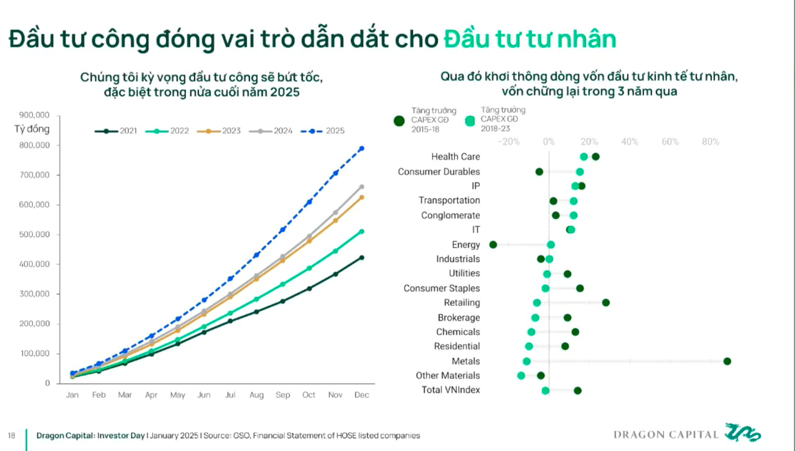 Nhìn chung, chuyên gia Dragon Capital kỳ vọng đầu tư công sẽ đột phá trong nửa cuối 2025, qua đó dẫn dắt dòng vốn đầu tư kinh tế tư nhân vốn chững lại trong 3 năm qua. Nếu niềm tin của khối doanh nghiệp tư nhân cao thì câu chuyện tăng trưởng kinh tế hai con số không khó.