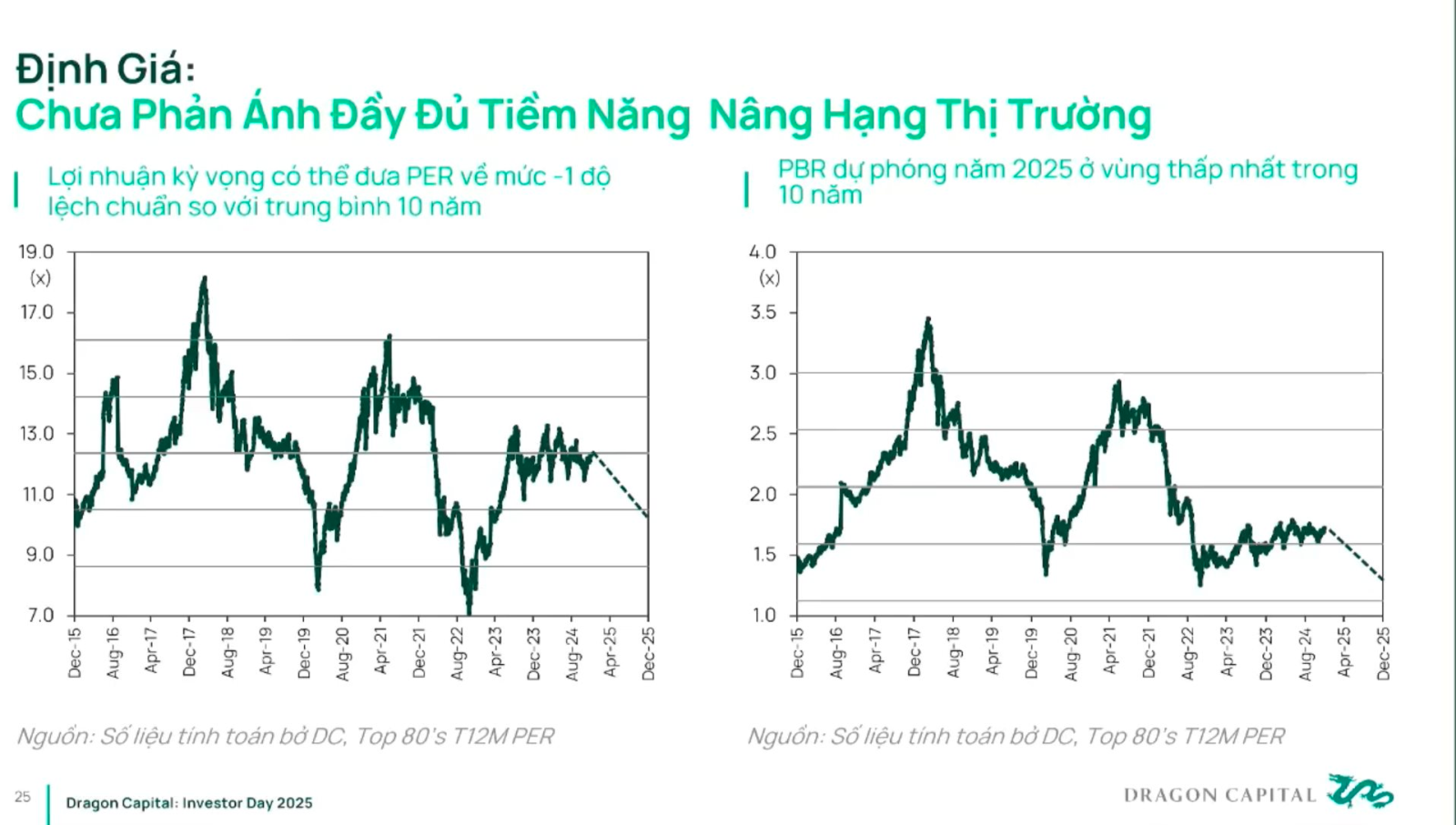 Thêm vào đó, định giá chưa phản ánh đầy đủ tiềm năng nâng hạng thị trường. Cuối năm 2025, lợi nhuận kỳ vọng có thể đưa PER về mức -1 độ lệch chuẩn so với trung bình 10 năm. Chỉ số PBR dự phóng năm 2025 cũng ở vùng thấp nhất trong 10 năm. Bất cứ lúc nào thị trường về vùng đáy này thì mua vào khó mất tiền. Với mức tăng trưởng lợi nhuận kỳ vọng, chuyên gia cho rằng định giá thị trường đang ở mức khá hấp dẫn.