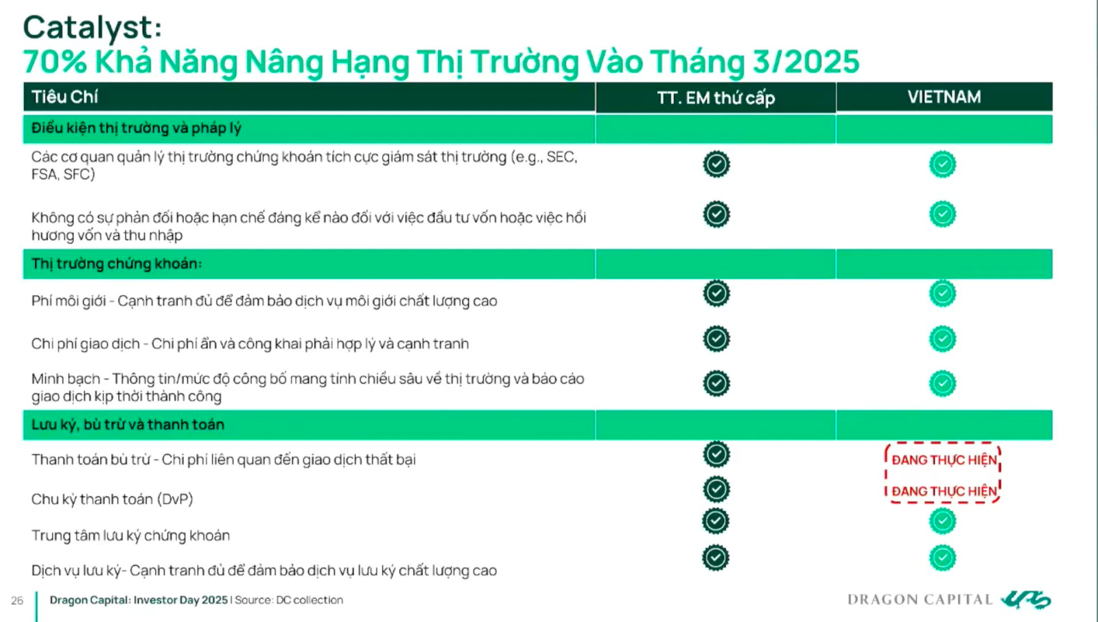 Trong bối cảnh hiện tại, khả năng thị trường chứng khoán được FTSE Russell nâng hạng và đưa vào nhóm thị trường mới nổi hiện đã lên rất cao. Theo dự báo của Giám đốc Dragon Capital, 70% khả năng thị trường sẽ được nâng hạng vào tháng 3/2025. Với 9 tiêu chí nâng hạng thị trường chứng khoán mà Russell đưa ra, Việt Nam chỉ còn chưa đáp ứng được 2 tiêu chí, bao gồm thanh toán bù trừ và chu kỳ thanh toán (DvP).