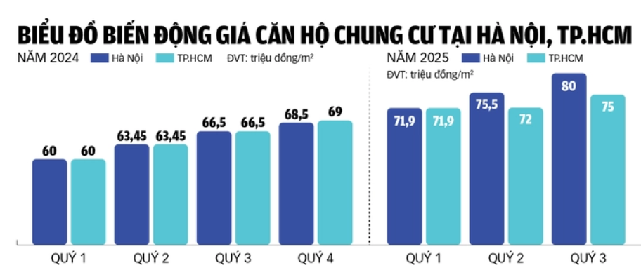 Trong báo cáo thị trường bất động sản 9 tháng đầu năm gửi tới Chính phủ mới đây, Bộ Xây dựng cho hay giá bán sơ cấp trung bình của căn hộ chung cư tại Hà Nội quý 3-2025 từ 70 - 80 triệu đồng/m2, tăng 5,6% so với quý 1 và tăng 33% so với cùng kỳ năm 2024. Một số dự án chung cư hạng sang tại Hà Nội ghi nhận giá bán 150 - 300 triệu đồng/m2.