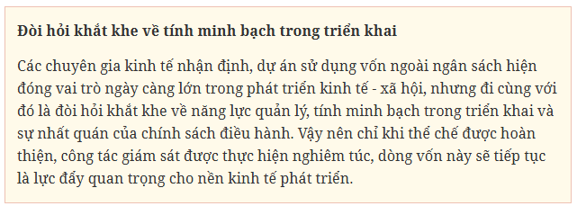 Theo các chuyên gia kinh tế, để khắc phục tình trạng báo cáo sơ sài, thiếu cập nhật và nâng cao hiệu quả quản lý các dự án vốn ngoài ngân sách, Việt Nam có thể nghiên cứu kinh nghiệm quốc tế trong việc xây dựng cơ chế giám sát sau đầu tư (post-project review). Mô hình này đã được áp dụng tại nhiều nước châu Âu, theo đó, sau khi dự án hoàn thành, cơ quan độc lập sẽ đánh giá lại toàn diện hiệu quả đầu tư, chất lượng dịch vụ và những bài học thực tiễn. Kết quả đánh giá không chỉ giúp minh bạch hóa thông tin, mà còn là cơ sở quan trọng để điều chỉnh chính sách và nâng cao chất lượng các dự án trong tương lai.