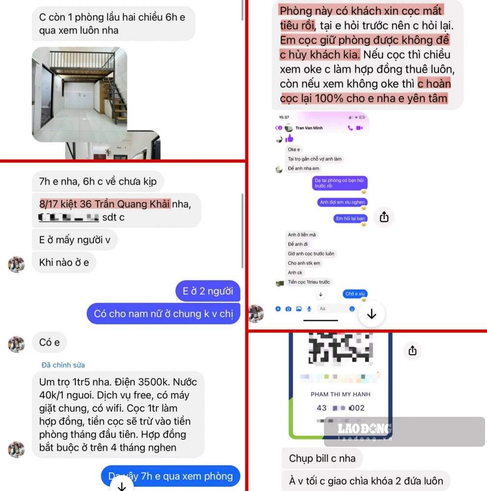Tháng 2.2025, Thy liên hệ tài khoản “Anh Minh Phòng Trọ” trên Facebook để thuê trọ. Sau khi gửi 400.000 đồng tiền cọc, người cho thuê tiếp tục yêu cầu thêm 600.000 đồng để làm giấy tờ. Khi Thy tìm đến địa chỉ cho thuê và phát hiện đó là dãy trọ thật nhưng cũ kỹ, không giống ảnh, thì người cho thuê sau đó viện cớ “đang nhập viện” rồi chặn liên hệ.