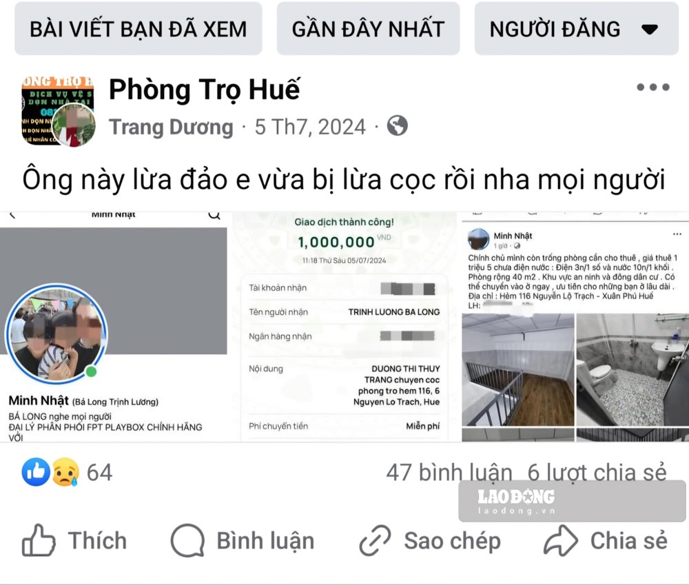 Từ cuối năm 2023 đến gần giữa năm 2025, nhiều bài viết “bóc phốt” các đối tượng lừa đảo tiền đặt cọc thuê trọ xuất hiện trên các nhóm Facebook thuê trọ tại Huế, nhưng nhiều người vẫn bị lừa dối, mất tiền oan.