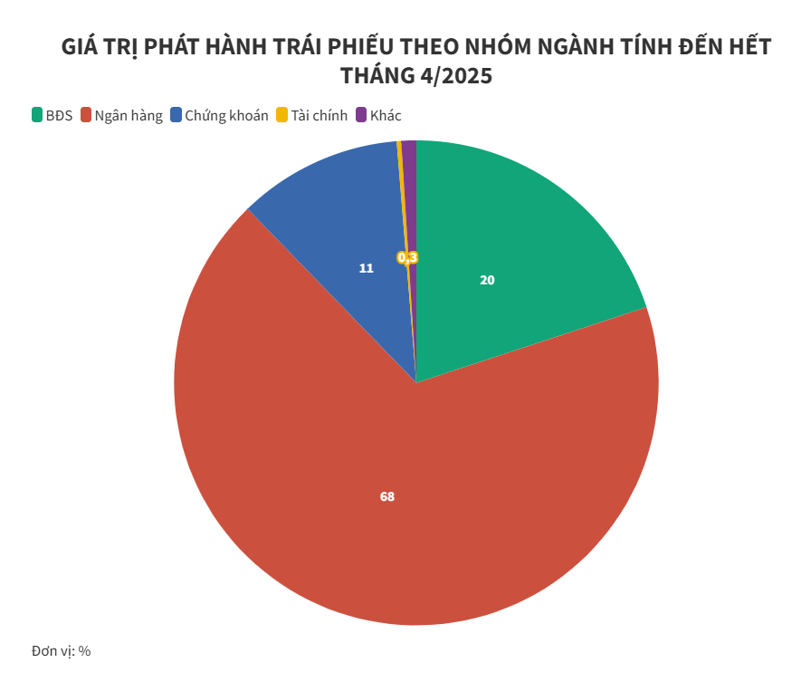 Nhóm ngân hàng hiện vẫn đang dẫn đầu về giá trị phát hành với tổng giá trị đạt 40.236 tỷ đồng, tương đương 68% tổng giá trị phát hành. Nhóm bất động sản đứng ở vị trí thứ hai với 6.508 tỷ đồng, chiếm khoảng 20%.