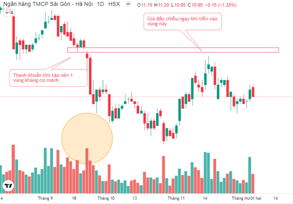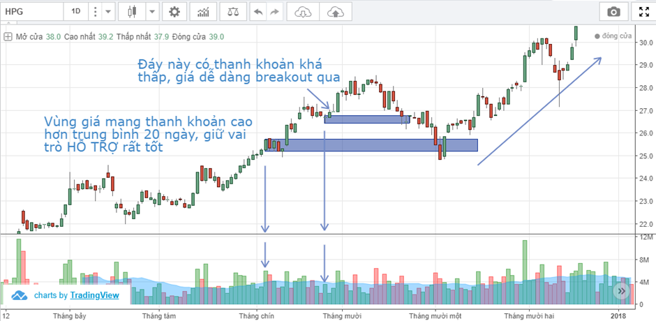 Chúng ta có một cách xác định vùng hỗ trợ nữa là dựa vào thanh khoản. Những cây nến hoặc vùng giá nào có thanh khoản cao hoặc cao bất thường thì đó là vùng cản khá tốt. Một khi giá hồi về, khả năng cao sẽ bị chặn lại tại đó.
