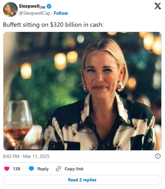 Một meme trên X về việc Warren Buffett ngồi trên khối tiền mặt khổng lồ.