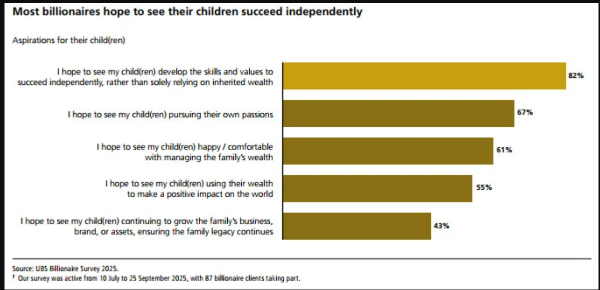 Hầu hết các tỷ phú đều kỳ vọng con cái mình sẽ thành công độc lập và theo đuổi đam mê riêng. Nguồn: Khảo sát Tỷ phú UBS 2025