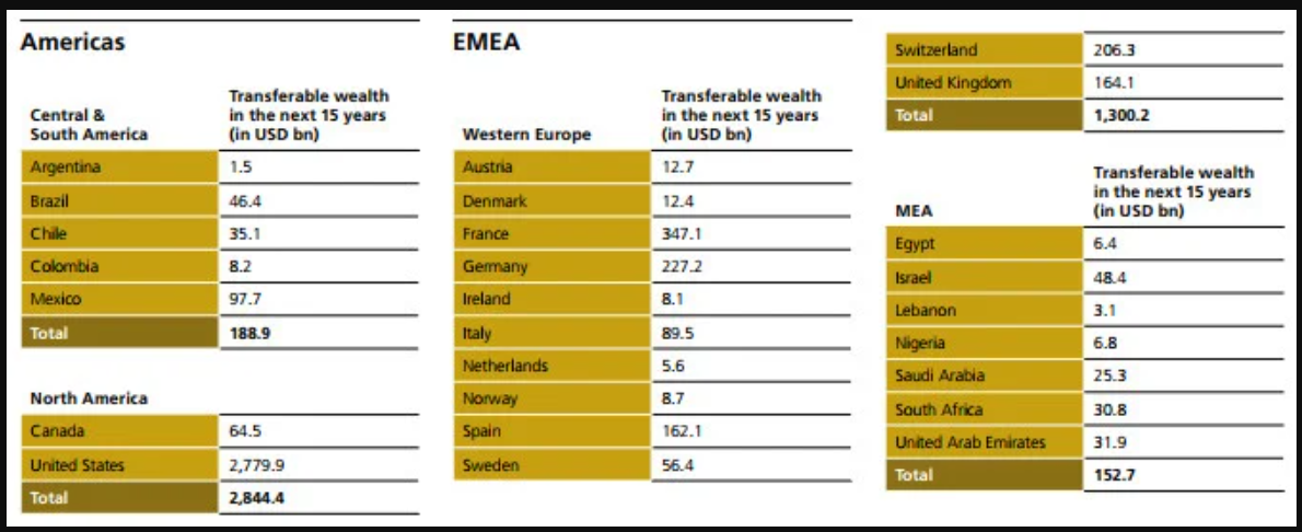 Hầu hết các tài sản thừa kế sẽ được chuyển giao ở Mỹ, Ấn Độ, Pháp, Đức và Thụy Sỹ. Tuy vậy, các tỷ phú, nhất là những người trẻ, cũng thường xuyên di chuyển nên bức tranh này có thể sẽ khác. Lý do để họ thay đổi nơi sống là mong muốn tìm kiếm cuộc sống chất lượng hơn, các lo ngại địa chính trị và cân nhắc về thuế. Những nước được lựa chọn nhiều bao gồm Thụy Sỹ, UAE, Mỹ và Singapore.
