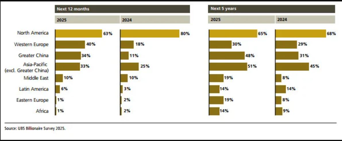 UBS đã phỏng vấn 87 khách hàng tỷ phú cho báo cáo và nhận thấy rằng sức hấp dẫn của Bắc Mỹ như là nơi đầu tư tốt nhất trong ngắn hạn đã giảm xuống còn 63% từ 80% một năm trước đó.