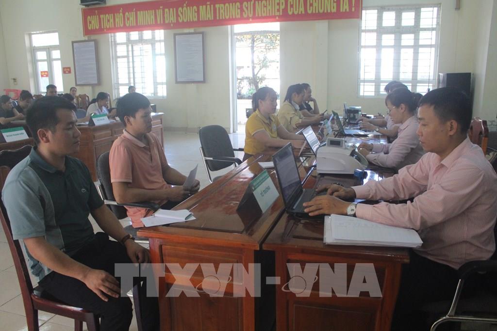 Người dân đến giao dịch tại các điểm giao dịch Phòng giao dịch Ngân hàng CSXH Quan Sơn (Thanh Hóa). Ảnh: Khiếu Tư - TTXVN