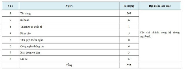 Mới đây, Ngân hàng Nông nghiệp và Phát triển Nông thôn Việt Nam (Agribank) thông báo tuyển dụng 323 chỉ tiêu làm việc tại các chi nhánh trên toàn quốc. Các vị trí được tuyển gồm: Tín dụng, Kế toán, Thanh toán quốc tế, Pháp chế, Thủ quỹ, Kiểm ngân, Công nghệ thông tin, Xây dựng cơ bản và Lái xe.