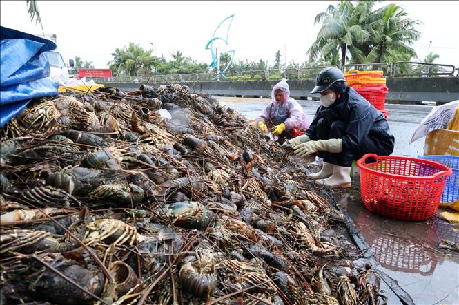 Tôm hùm đang trong giai đoạn chuẩn bị thu hoạch bị chết hàng loạt do nước lũ. Ảnh: Đỗ Trưởng/ TTXVN